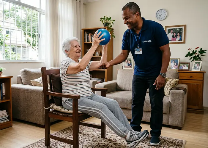 Mobilidade: Suporte para locomoção dentro e fora do leito, auxílio em caminhadas e exercícios leves, visando manter a autonomia e prevenir quedas.
